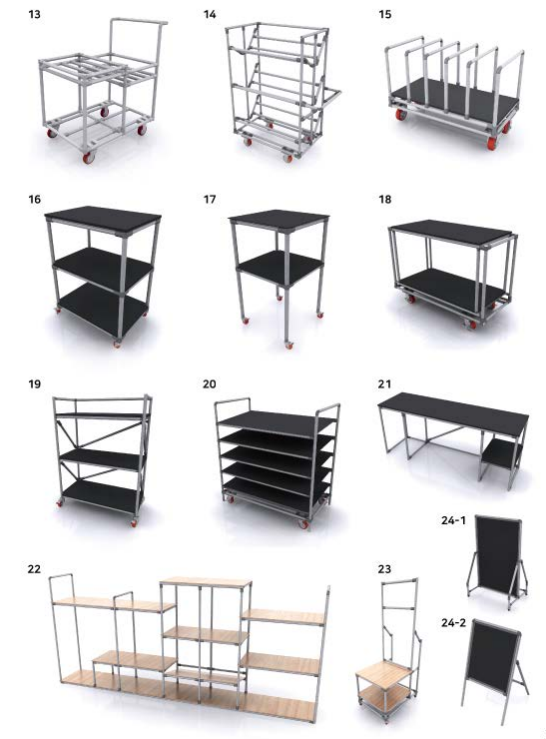- Tính mô-đun: Các thành phần chính bao gồm ống thép bọc nhựa (đường kính Ø 28 mm là tiêu chuẩn), khớp nối, thanh trượt con lăn và phụ kiện. Điều này cho phép người dùng tự thiết kế và lắp ráp các cấu trúc phù hợp với nhu cầu cụ thể.
